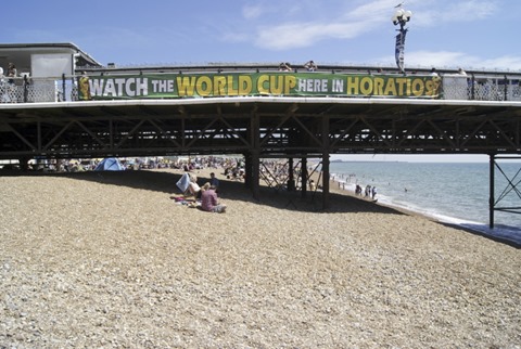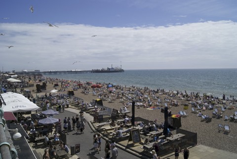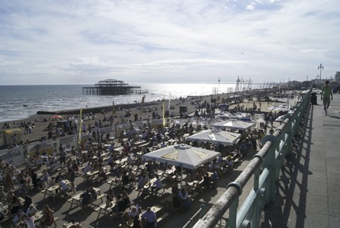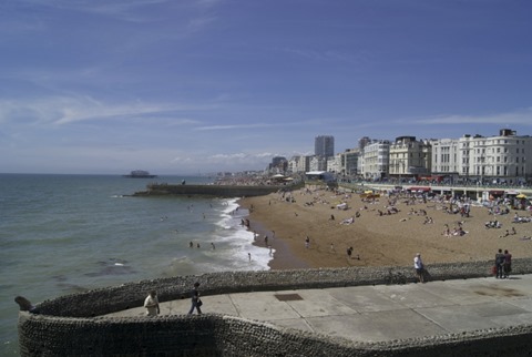 8a e última parte. No dia anterior a data em que voltaríamos para casa, fomos visitar Brighton, uma cidade costeira próxima de Red Hill. Na verdade Red Hill fica mais ou menos a meio caminho entre Londres e Brighton, pela linha do trem, no sentido norte-sul. E pelo visto, Brighton deve ser um destino costumeiro dos Londrinos e moradores da região nos fins de semana do verão, pois o trem, a cidade e principalmente a praia estavam bem cheios…nada como no Rio de Janeiro ou outra cidade praiana do litoral de São Paulo em feriados, mas ainda sim, bastante gente.