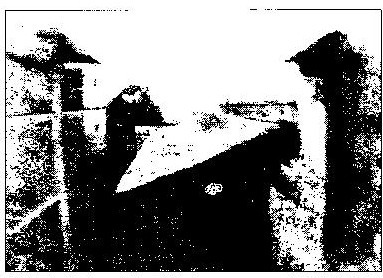 The French inventor Joseph Niépce (that later changed his first name to Nicéphore in honor of Nicephorus of Constantinople) managed to fix this photographic image using bitumen dissolved in lavender oil, in 1825. The exposure in a camera obscura ran to eight hours, and shows the view across the courtyard at his home.