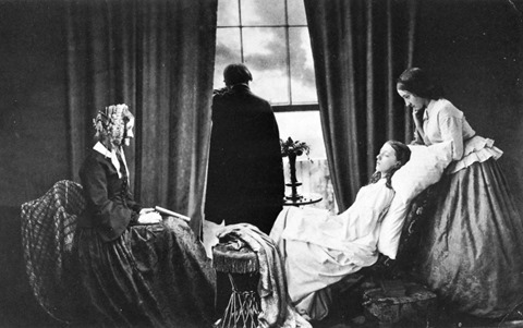 Henry Peach Robinson and Oscar Gustave Rejlander were the first practioners of “combination printing” in which meticulously planned negatives were cut together to form a montage, sometimes a moral narrative, but very often of domestic scenes involving sickness and death. Robinson operated in Leamington Spa as a portrait photographer, while Rejlander was in Wolverhampton gaining a reputation for erotic photography. Both were founding members of the Birmingham Photographic Society, but Robinson became seriously ill from exposure to darkroom chemicals and had to give up studio work aged only 34. Rejlander finally redeemed his dubious reputation by selling a ten-guinea print of an improving nature to Queen Victoria.