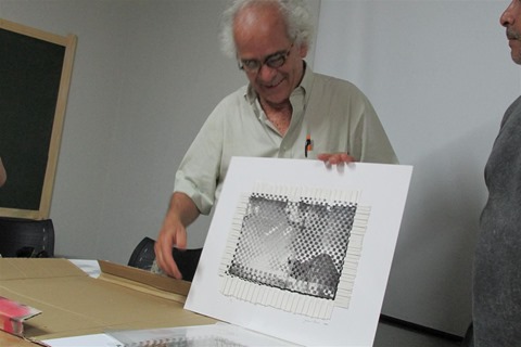 O primeiro dia foi finalizado com o Juvenal apresentando um trabalho que ele vem desenvolvendo algum tempo, chamado “Tramas”. Nesse trabalho, ele seleciona duas imagens. Cada imagem é fatiada em tiras bem finas – a imagem é literalmente cortada em tiras. Estas tiras são entrelaçadas manualmente, como em uma trama. Dessa forma as duas imagens são mescladas em uma só. O ponto inicial da trama é onde o Juvenal desejava dar mais destaque, pois nesse ponto a trama será mais precisa. É um trabalho muito interessante e diferente. Vale a pena conferir.