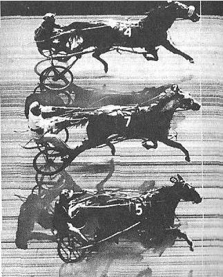 The Photo-Finish camera secures the required image by moving the film laterally past a vertical slit facing the action. The film is transported at approximately the same speed as the subject, but if it moves slowly, the typical elongated image occurs. Modern digital photo-finish cameras operate at an equivalent shutter speed of 1/2000 sec, and are linked to a computer which rapidly analyzes the image. The first recorded triple dead-heat in harness-racing (trotting) occurred in October 1953.